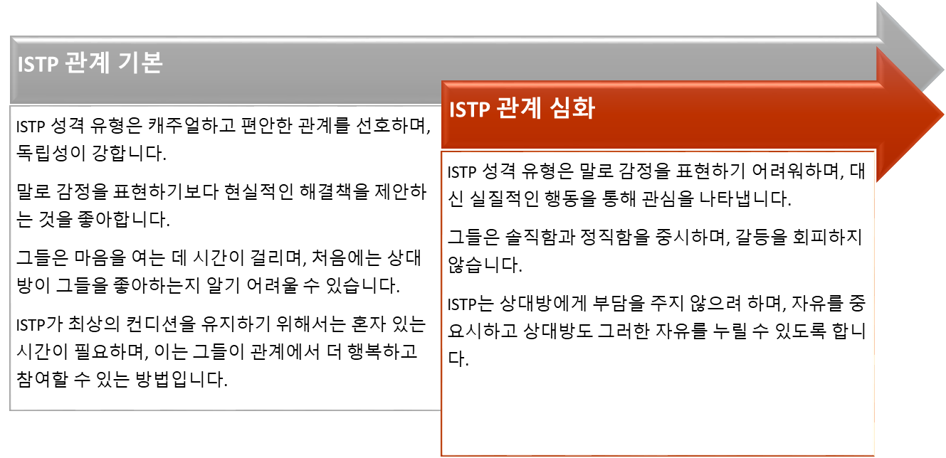 ISTP는 흥미진진하고 편안한 관계를 선호하며, 상대방에 대한 충성과 인정에 중요성을 둡니다. 감정 표현에 서툴지만, 선물이나 실질적인 행동으로 애정을 드러냅니다.