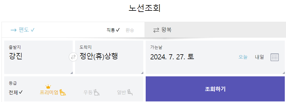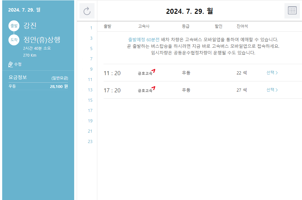 위에 그림에서 조회하기 버튼을 누르면 아래같이 가는 시간대가 나타나고 좌석도 얼마나 남았는지 표시가 됩니다.