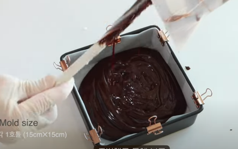 비커 벽, 바닥을 싹싹 긁어서 섞어주면 완성입니다. 섞어준 초콜릿을 틀에 붇고 흔들어서 수평을 만들어 줍니다.