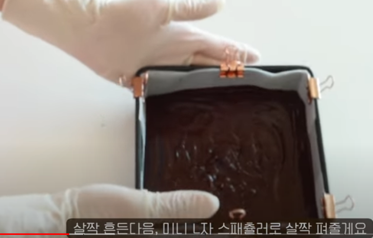 그다음 미니 L자 스페츌러로 곱게 펴줍니다. 펴진 초콜릿을 랩핑해서 냉장공에서 2시간 굽혀주면 완성입니다. 이