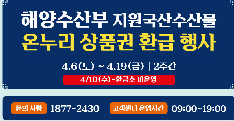 4월 달에는 수산인의 날로 지정하여 4월 4일 목요일부터 4.21일 일요일까지 진행되며 만약 기회를 놓쳐다면 그다음 닥인 5월 달과 6월에도 행사에 참여 가능하니 이점 놓지 지지 마시고 이용하시면 매달 저렴하게 수산대전에서 수산물을 이용하실 수 있습니다.