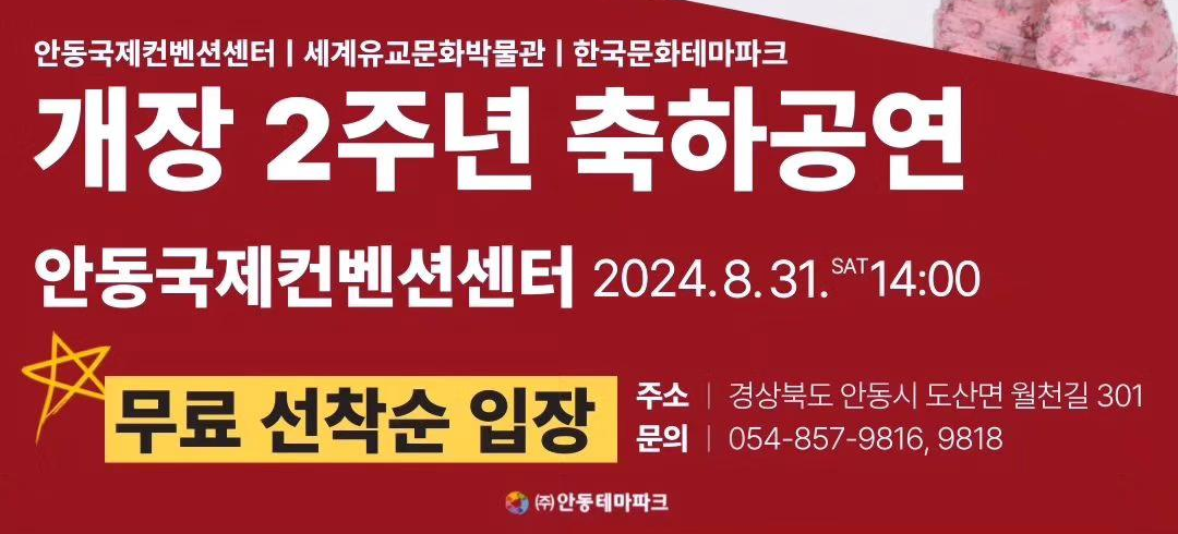 안동국제컨벤션센터 세게 유교문화박물관 한국테마파크 개장 2주년 축하공연이 열립니다. 무료 선착순 입장이니 이 기회를 놓치지 않으셨으면 합니다.