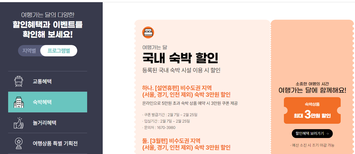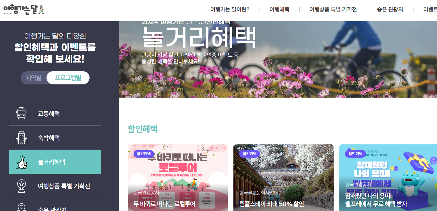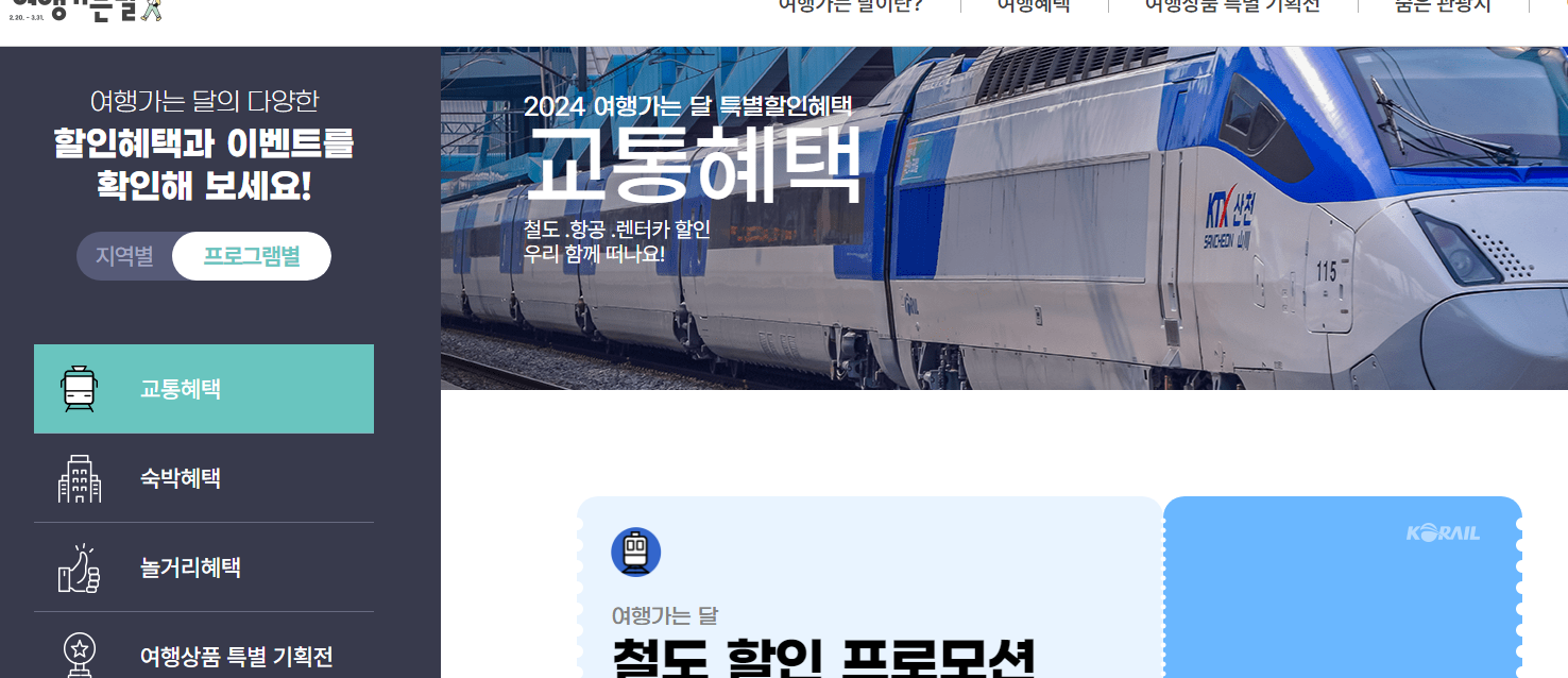 여행가는 달 누리집 가면 전체적으로 혜택 볼 수 있는 것 여행 상품들 여러가지를 한눈에 확인 하실 수 있습니다. 교통,숙박,놀거리 혜택 등이 있어서 어디에서 골라 되는 것을 모를때는 우선 여기 홈페이지에 접속하셔서 여행 계획을 참고 하시면 좋을 듯합니다.
