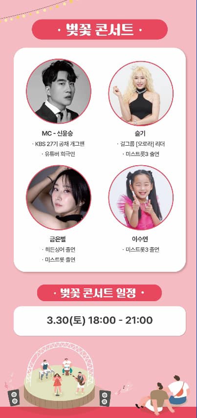 유튜버 희극인 출연/품바공연/벚꽃 버스킹/벚꽃 콘서트/벚꽃길 스탬프 투어/에어바운(어린이 놀이터)/푸드트럭