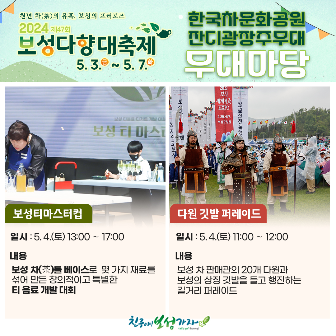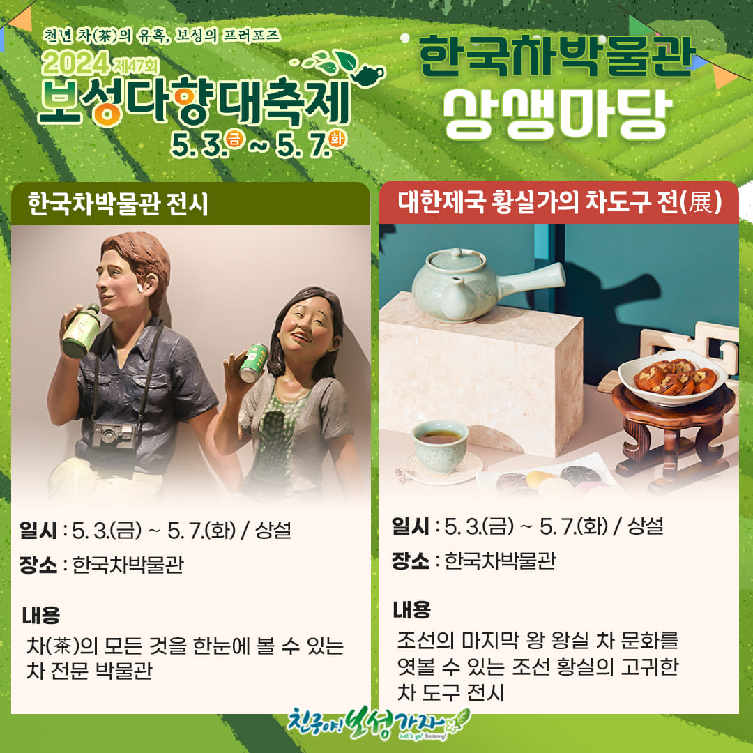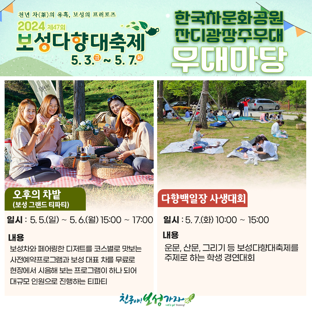 - 보성아 반가워: 녹차스탬프투어, 소원지 쓰기, 나만의 차 마시기, 초록파티 선물 나눔, 한복 입기 체험 등