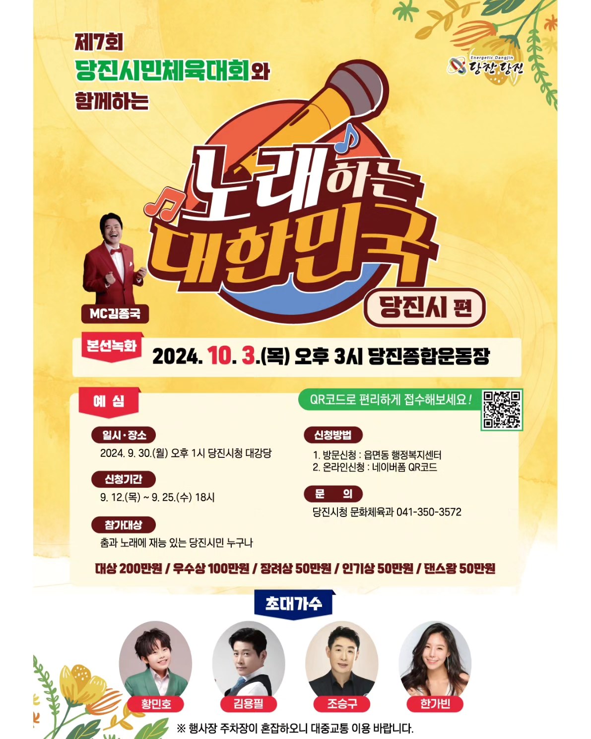 충청남도 당진시에서, 함께 여는 미래, 행동하는 당진이라는 슬로건으로 당진시민 체육대회가 열립니다. 인기 가수들이 축하공연도 펼치니 이 기회를 놓치지 마시고 체육대회를 같이 즐기 셨으면 합니다.