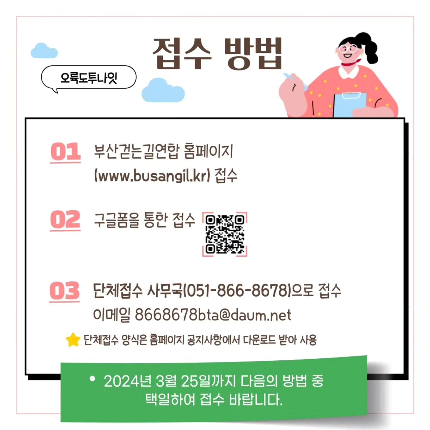 (사)부산 걷는 길연합은 3월 30일~31일까지 부산 다대포해수욕장에서 '제5회 2024 오륙도 투나잇 걷기 대회'를 실시합니다