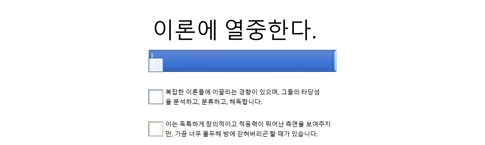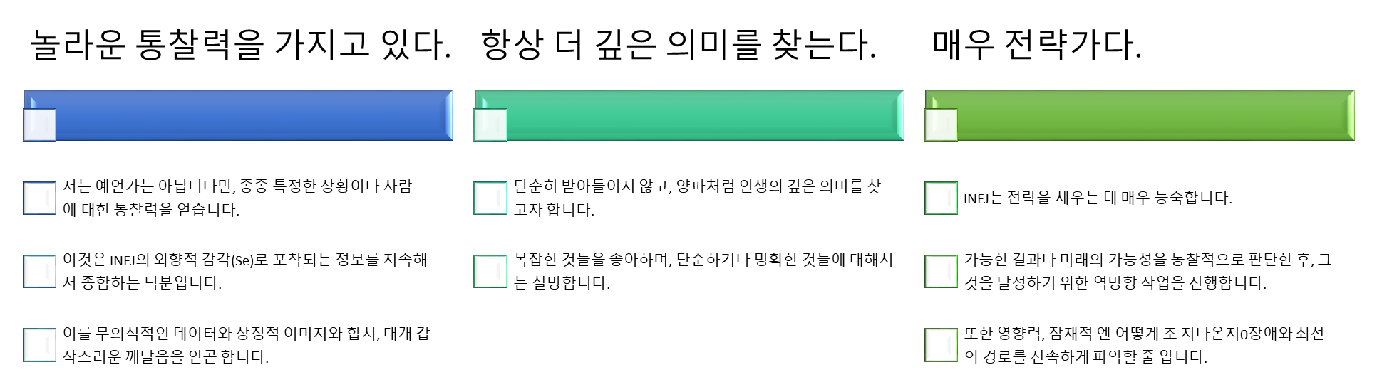 | 그 모두에게 공통점이 있어. | 일반화는 INFJ에게 불쾌감을 줍니다. 사람들은 각기 다르며, 상황도 복잡합니다. 성급한 일반화나 단편적 사고는 INFJ를 분노시킵니다. |