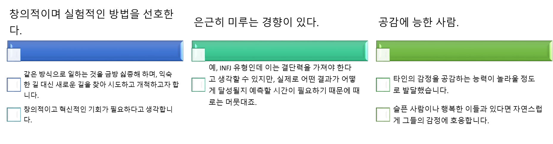 | 이겨라! | INFJ는 상처를 받았을 때 치유과정과 회복에 시간이 필요합니다. "극복"하라는 말로 서둘러봤자, 그들에게만 짜증과 오해가 남을 뿐입니다. |