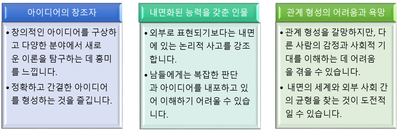 다른 사람들을 싫어하지만 그들의 동작과 행동에 대해 흥미를 느낄 수 있습니다. 또한 추리에 흥미를 가지며, 스몰토크는 잘하지 못합니다. 이 유형은 지식에 대한 욕망이 강하며 진지한 성향을 가지며, 게으르고 미루기에 능숙합니다. 인간관계에서는 계산적인 면이 강하며 호불호가 분명하고 시끄러운 환경을 피하는 경향이 있습니다.