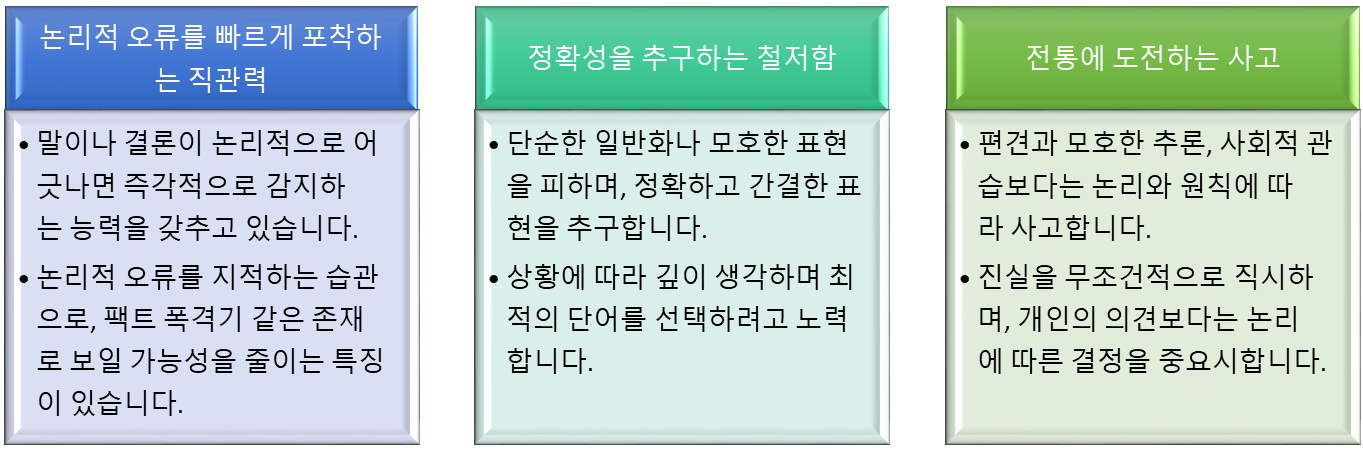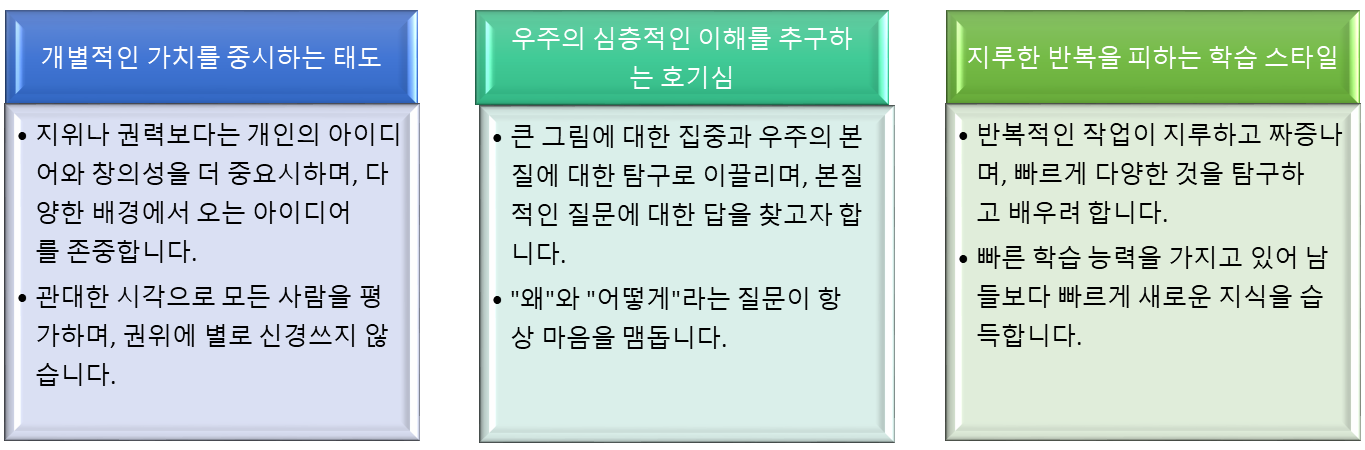 | 자유로운 사고를 방해하는 환경을 만들어 준다는 말 | INTP 성격 유형은 결정과 규칙에 대해 의심을 갖거나 논쟁적일 수 있습니다. 그들이 합리적인 결정을 내릴 때까지 인내심 있게 기다려주는 것이 중요합니다. INTP는 혁신적인 사고를 가지며, 무엇이든 단순히 받아들이지 않고 질문하고 분석하려고 합니다. |